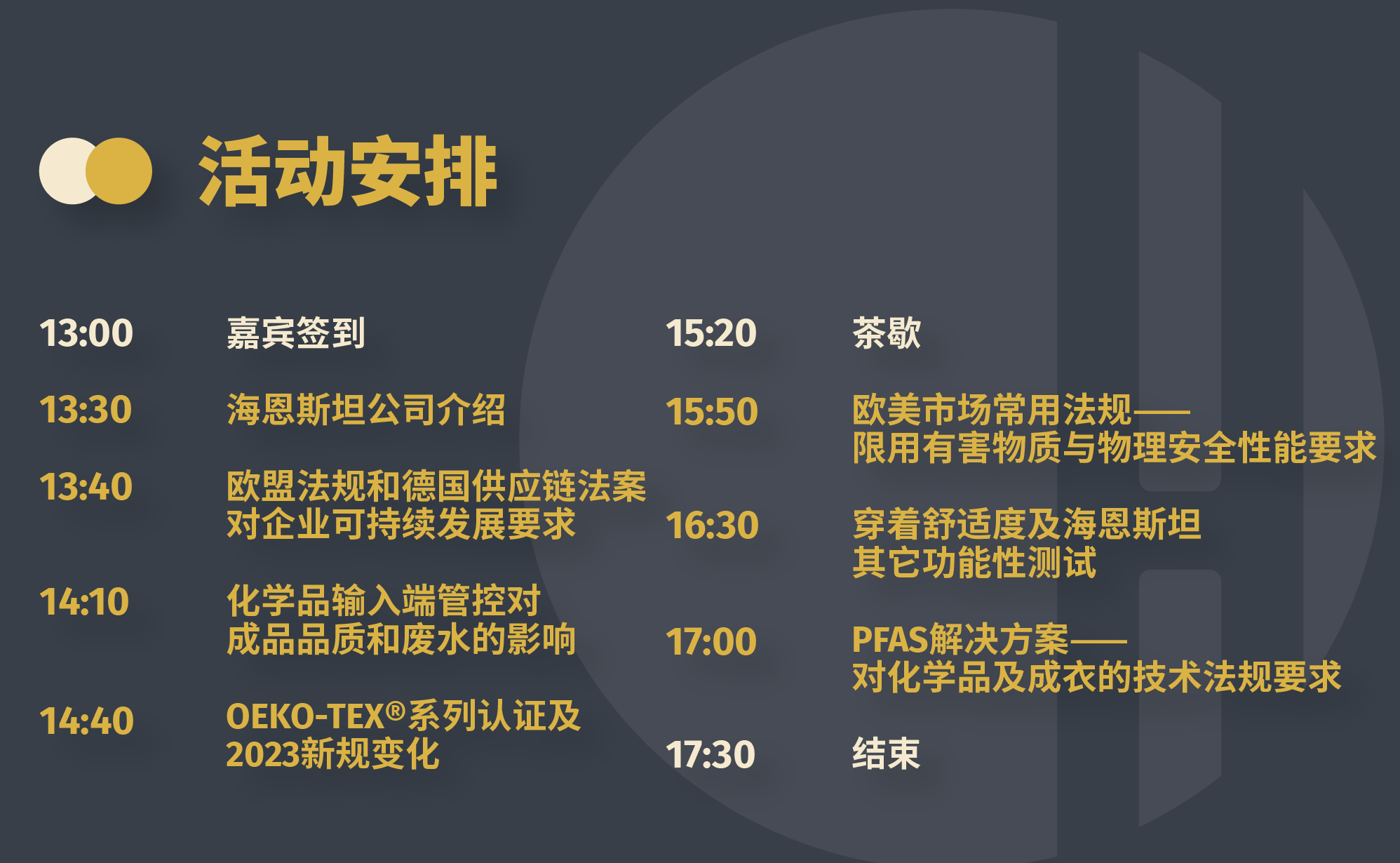 阔别两年,海恩斯坦线下巡回交流会于5月火热回归,将在杭州、盛泽、东莞、威海、厦门5地举办。届时与大家面对面交流纺织业很新趋势及全球法规等主题内容,帮助企业更好地服务于全球客户,精确匹配不同出口国市场的客户需求,稳住订单并拓展市场。我们准备了满满的干货和精美好礼期待您的到来!