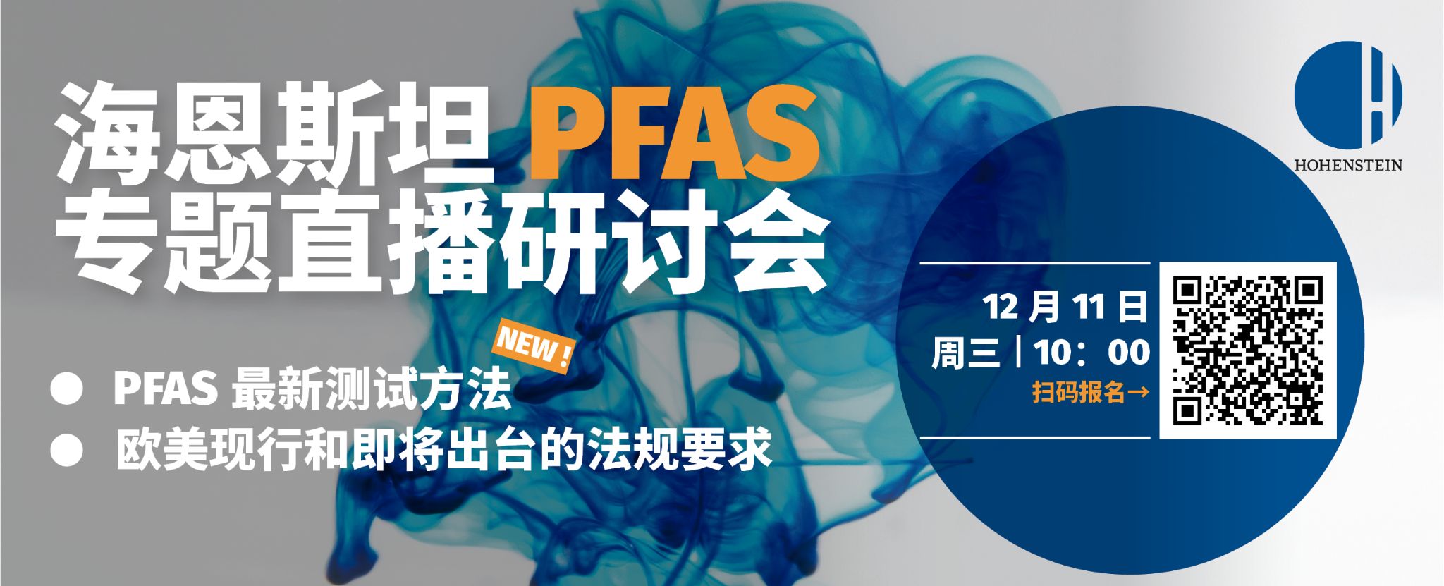 12月11日,海恩斯坦将举办PFAS专题直播研讨会,为大家详细解析PFAS最新测试方法及欧美现行和即将出台的PFAS法规要求,帮助企业及时提供应对方案。扫描下方二维码预约报名,我们将为您发送参会链接,还有直播间惊喜抽奖等您参与~