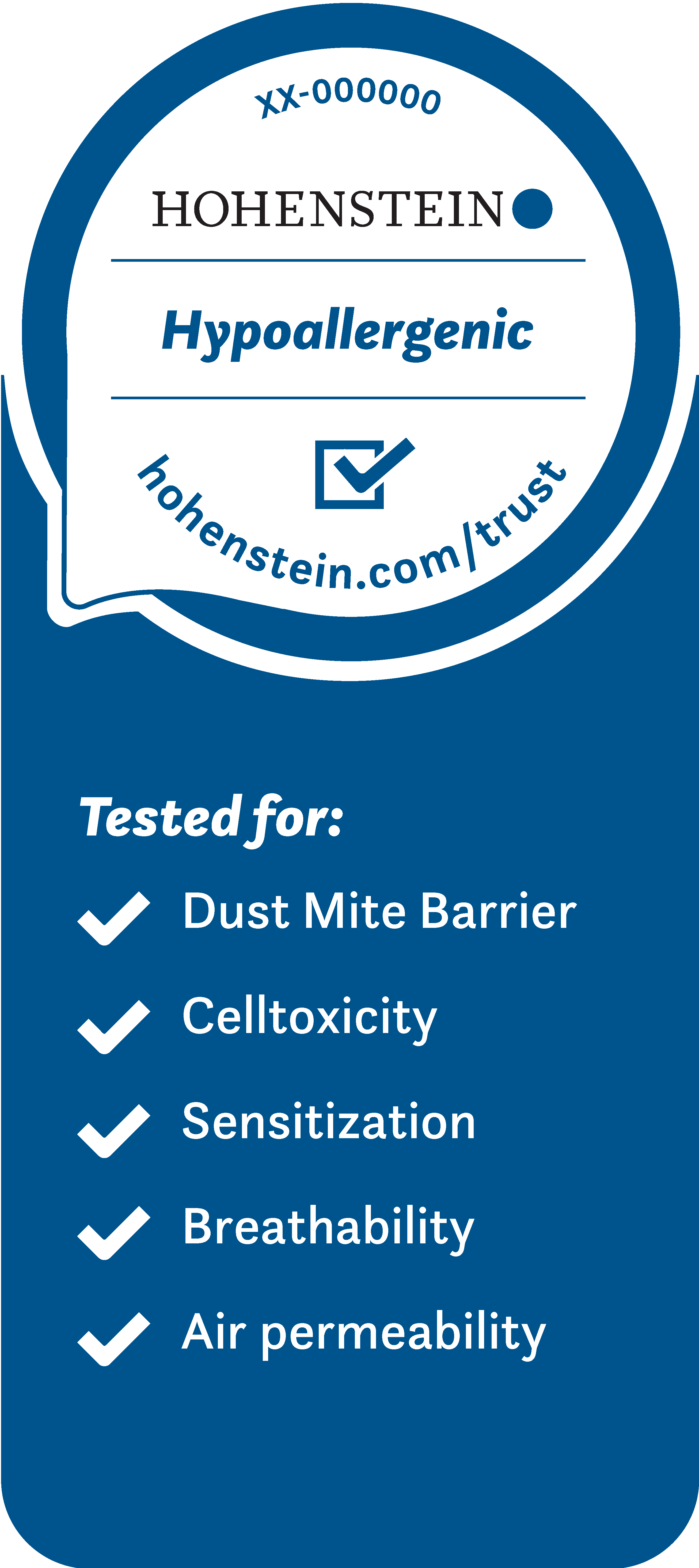 按照NF G39-011标准检测纺织品及整理剂抗室内尘螨的有效性。将室内尘螨施于测试样品和对照品上,在最佳条件下分别于一周及两个繁殖周期(约 6周)后,在立体放大镜下手数活螨的数量。因结构原因而无法手数的测试样品,在6周后测定过敏原含量(螨虫排泄物过敏原Der p1)。质量标签表明测试样品中的螨虫数量或过敏原含量与对照材料相比至少减少90%。质量标签以测试报告的详细结果为依据。