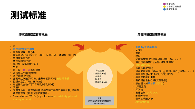 在“法律禁用或监管的物质”里 对重金属如镍,铬的限量值为1.0 mg/kg;有机锡化合物(TBT, TPhT, DBT, DOT)限量值为0.5 mg/kg;双酚A的限量值为100 mg/kg。