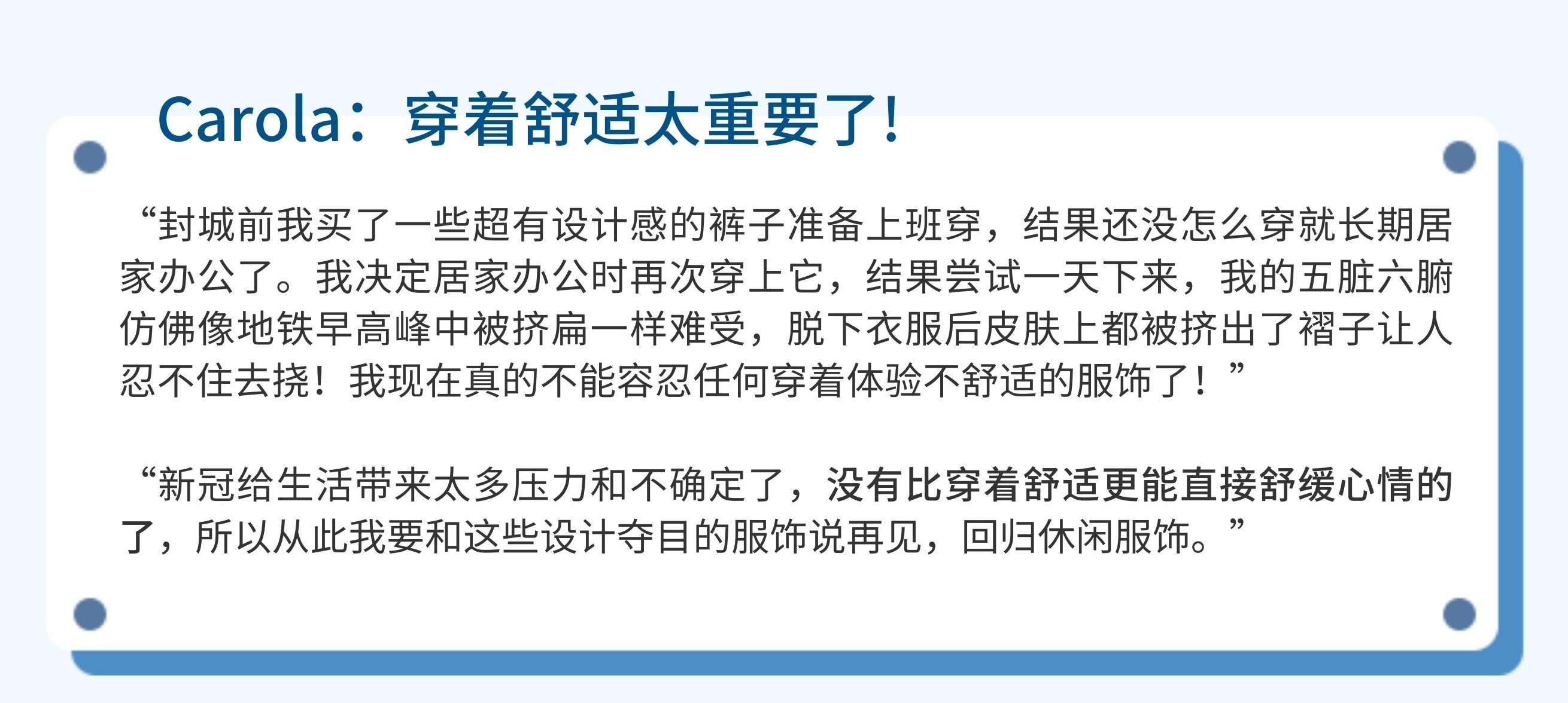 受疫情影响,伴随而来的居家办公的普及和隔三岔五的防控使得很多人的生活越来越集中于家这一舒适安全的代名词空间。随着居家办公的常态化,不少人开始全身搭配不具备严格办公和生活界限的休闲服饰,只为追求舒适。疫情中增加的独处时间使得消费者更加重视商品的使用体验,美国Carola Long用亲身经历验证这一趋势。