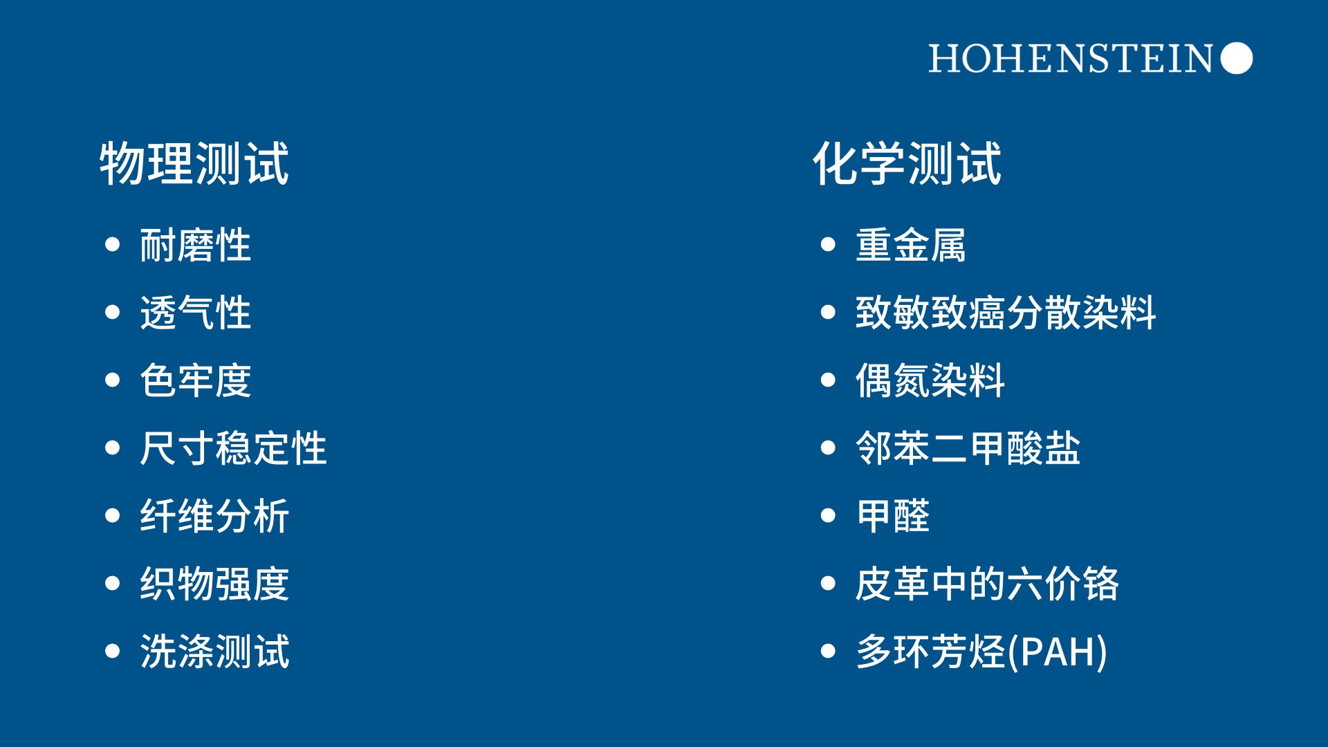 作为经国际认可的检测实验室,海恩斯坦还可根据企业及其客户的个性化需求,提供量身定制的物理或化学测试,全方位地满足不同的检测需求。可测试参数部分展示: