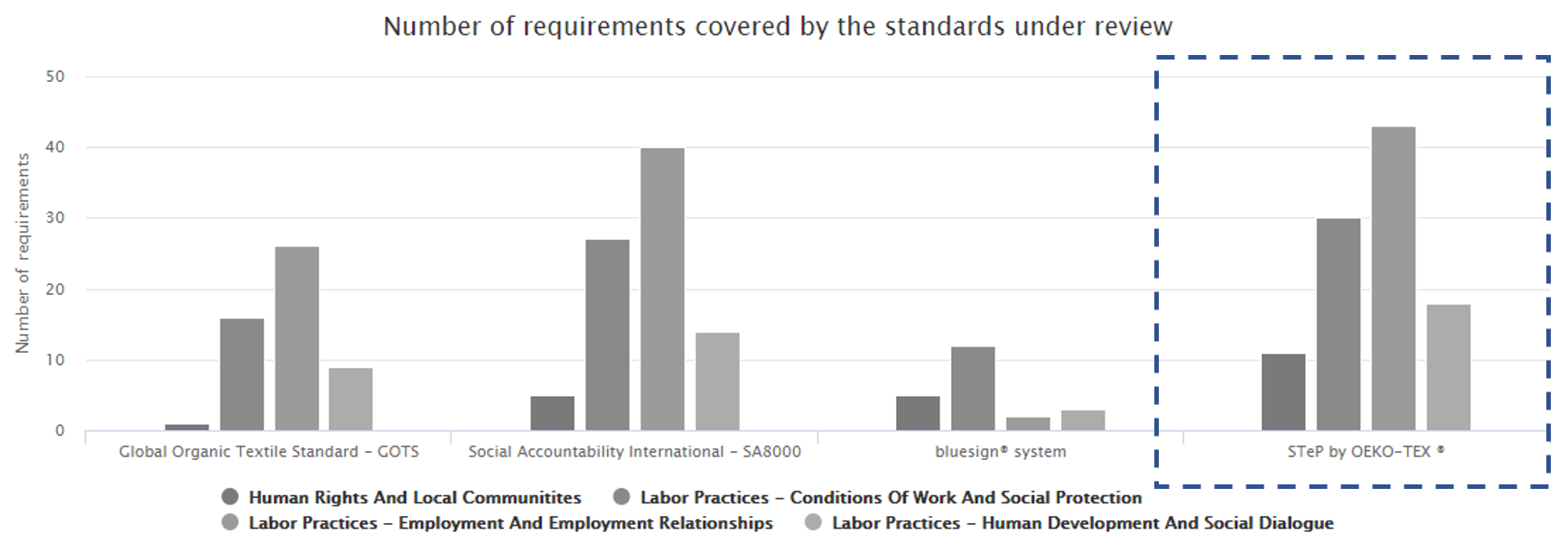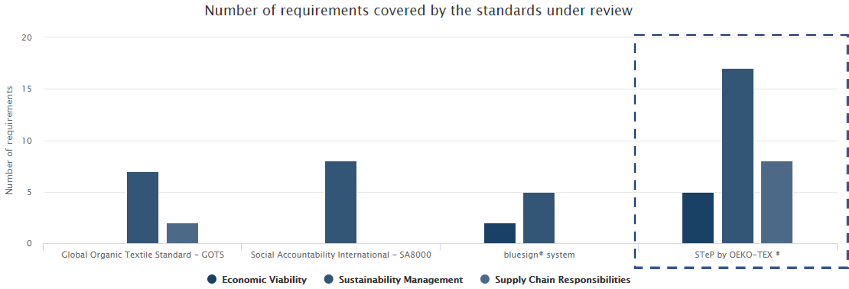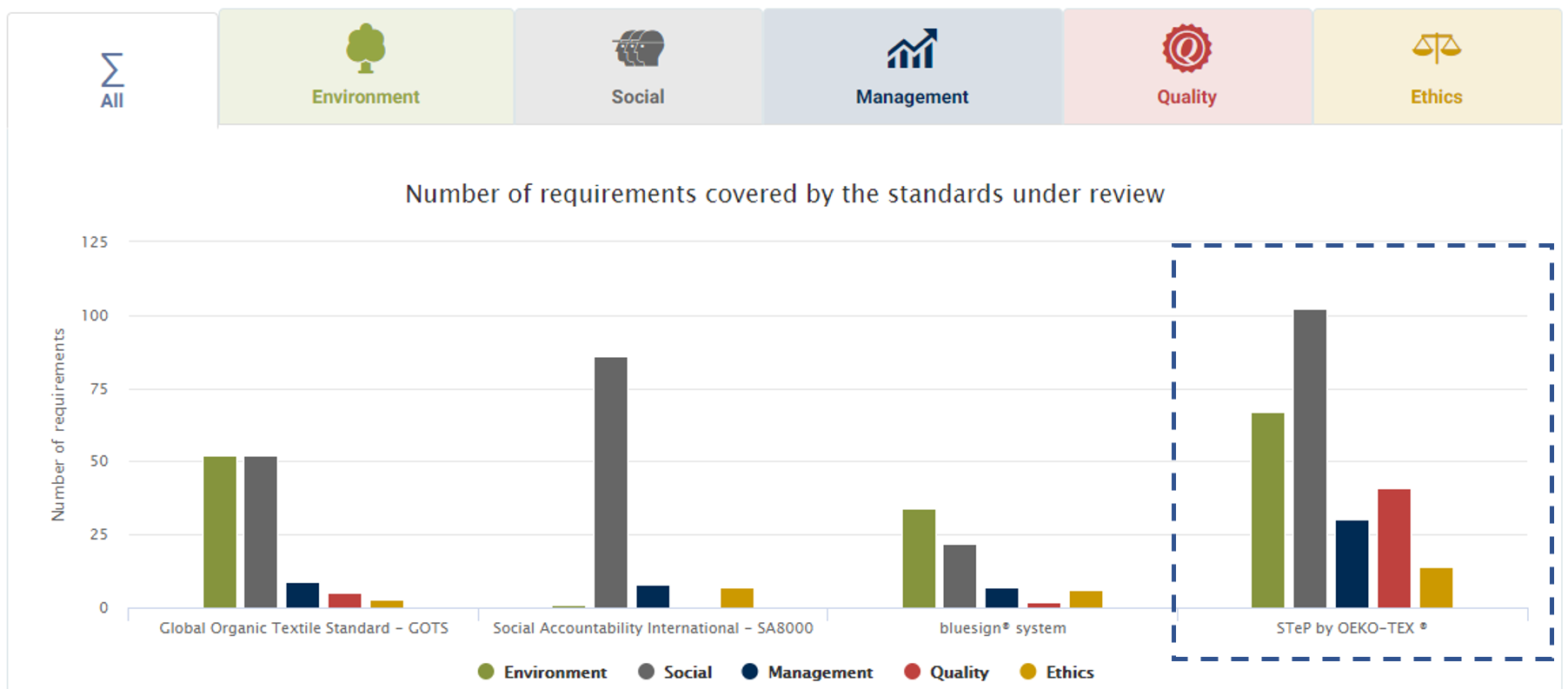 从上图中可以看到,GOTS认证在环境绩效方面表现优良,SA8000在社会责任方面也可圈可点,相较于这三种认证体系只在某一或某几模块表现较好,STeP by OEKO-TEX®认证则是更全面、更完善的。无论是五大模块中的哪一项,STeP认证所涵盖的标准要求数量都远多于其他认证。