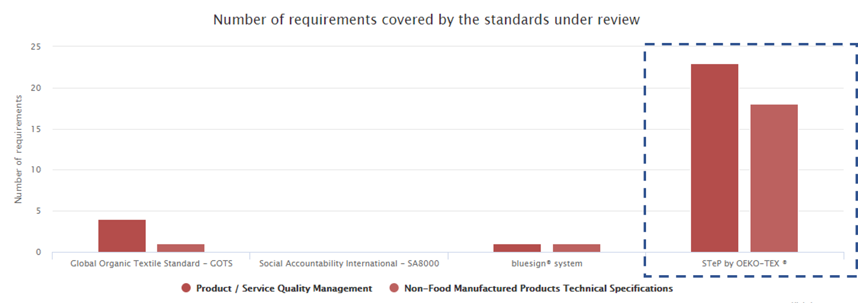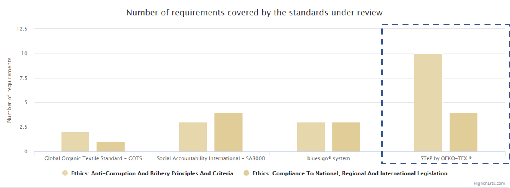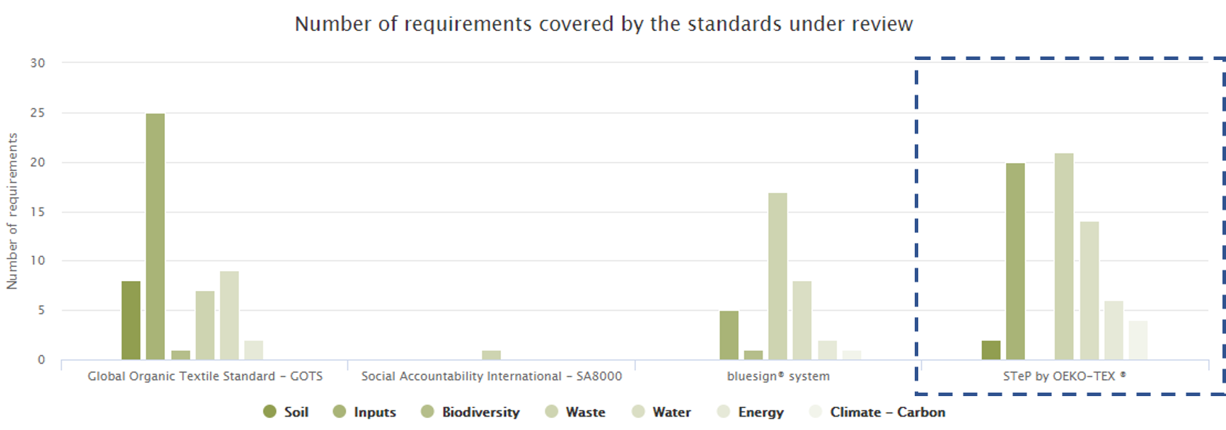 从上图中可以看到,GOTS认证在环境绩效方面表现优良,SA8000在社会责任方面也可圈可点,相较于这三种认证体系只在某一或某几模块表现较好,STeP by OEKO-TEX®认证则是更全面、更完善的。无论是五大模块中的哪一项,STeP认证所涵盖的标准要求数量都远多于其他认证。
