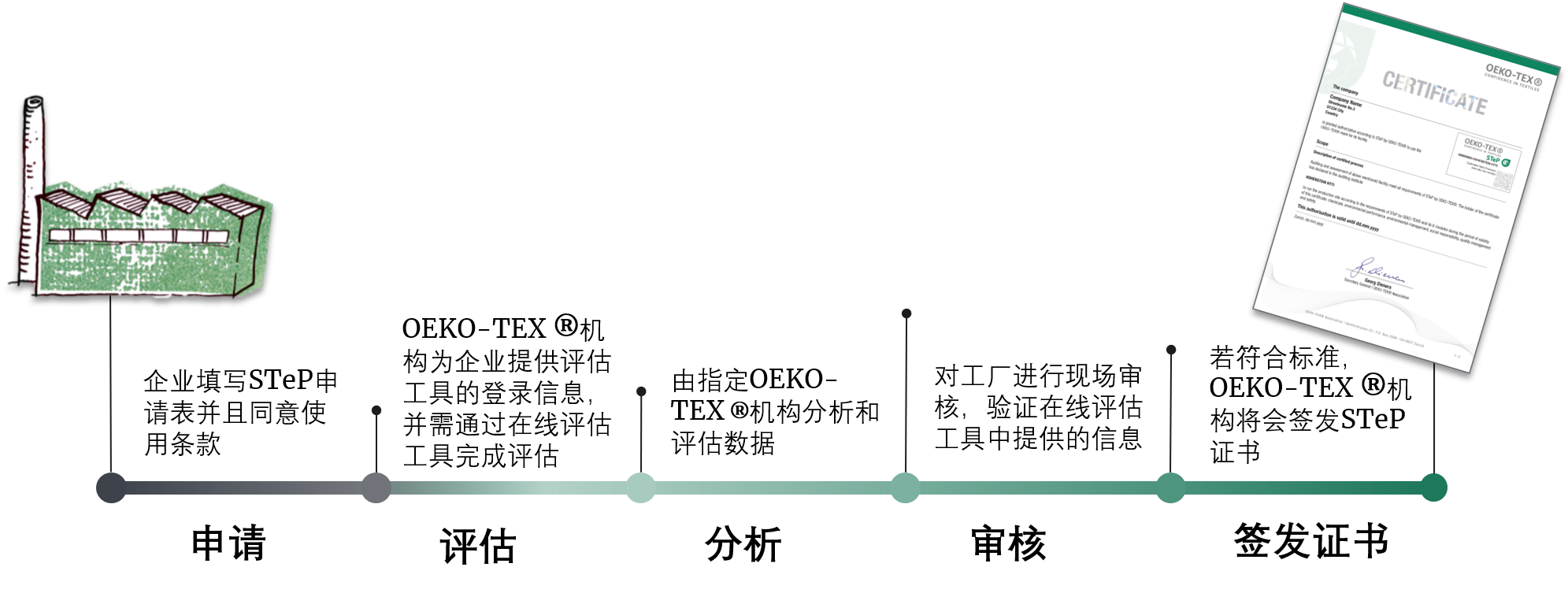 STeP by OEKO-TEX®是针对纺织企业供应链的一个独立认证体系。通过该认证帮助品牌商、生产商和零售商分析、验证以及优化工厂的可持续发展、社会责任和生产环境。认证降低了从纤维生产到产品加工的整条纺织品生产链的相关危险和风险,旨在提高生产设施的可持续性、品质和资源利用效率。