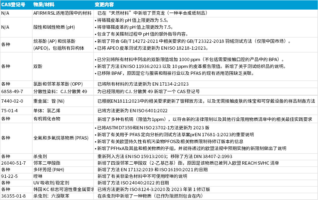 今年2月,服装及鞋袜国际RSL管理工作组(AFIRM)发布了2024第9版限用物质清单(RSL),该清单通常每年更新一次。本次更新主要增加了对有机锡、双酚类物质和全氟和多氟烷基(PFAS)等物质的限制要求,以下是变更细节信息。