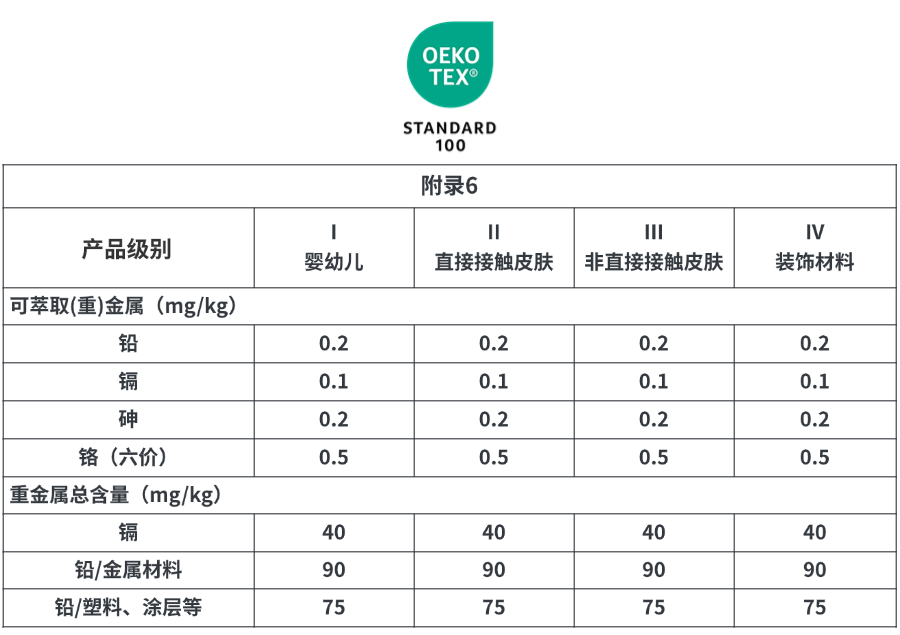 作为深受国际认可的独立检测认证,STANDARD 100可针对所有加工环节的纺织品原材料、半成品和成品以及所有辅料(拉链、纽扣、印标等)进行有害物质检测。
