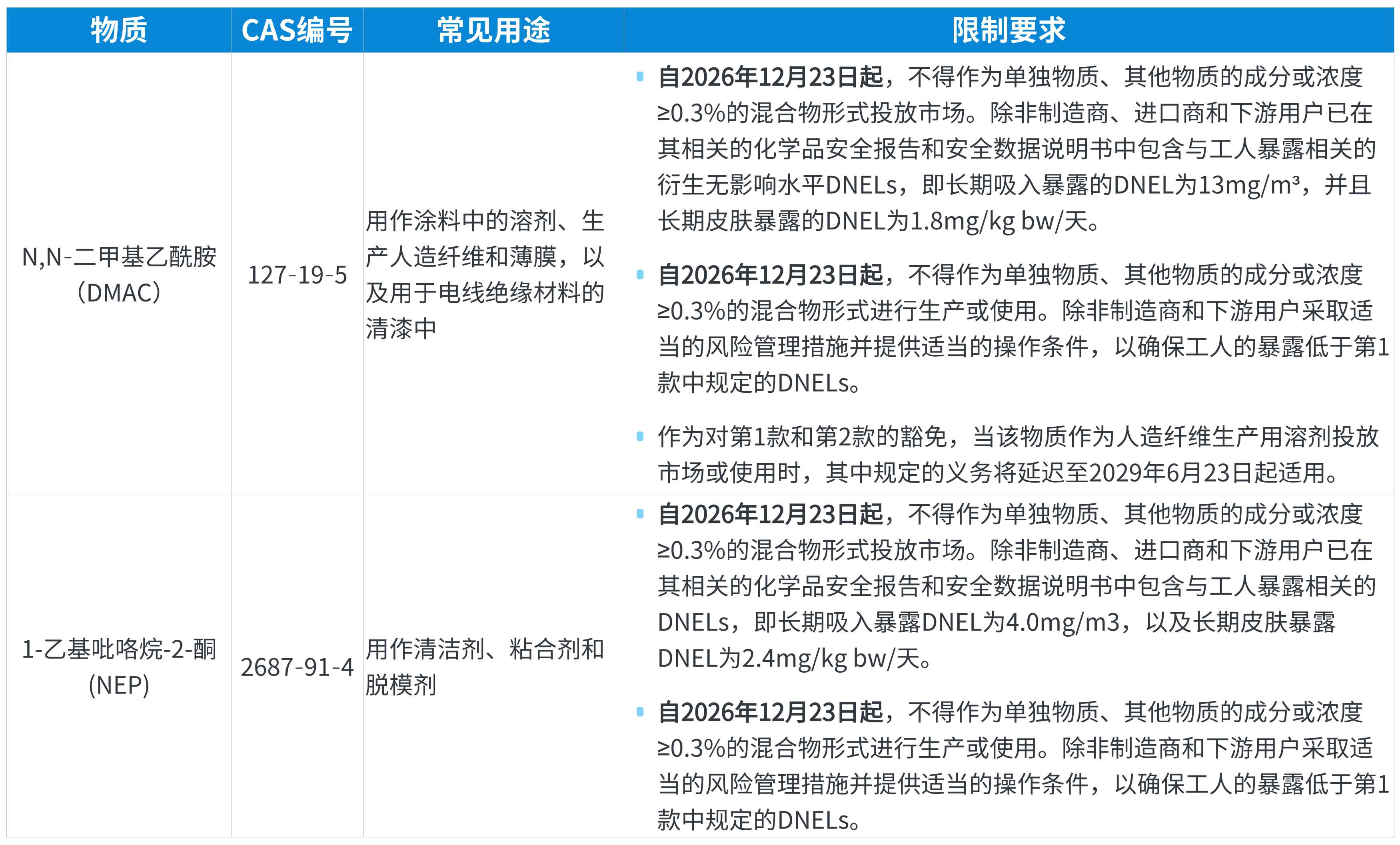 2025年6月,欧盟官方公报发布条例 (EU) 2025/1090,修订REACH附录XVII,新增第80项和81项条款,正式将N,N-二甲基乙酰胺 (DMAC)和1-乙基吡咯烷-2-酮 (NEP)纳入管控,并已于2025年6月23日生效。该两项物质均被欧盟《分类、标签和包装法规》(CLP)列为生殖毒性1B类物质,同时DMAC还被列为急性毒性物质4级,对人体健康构成风险。