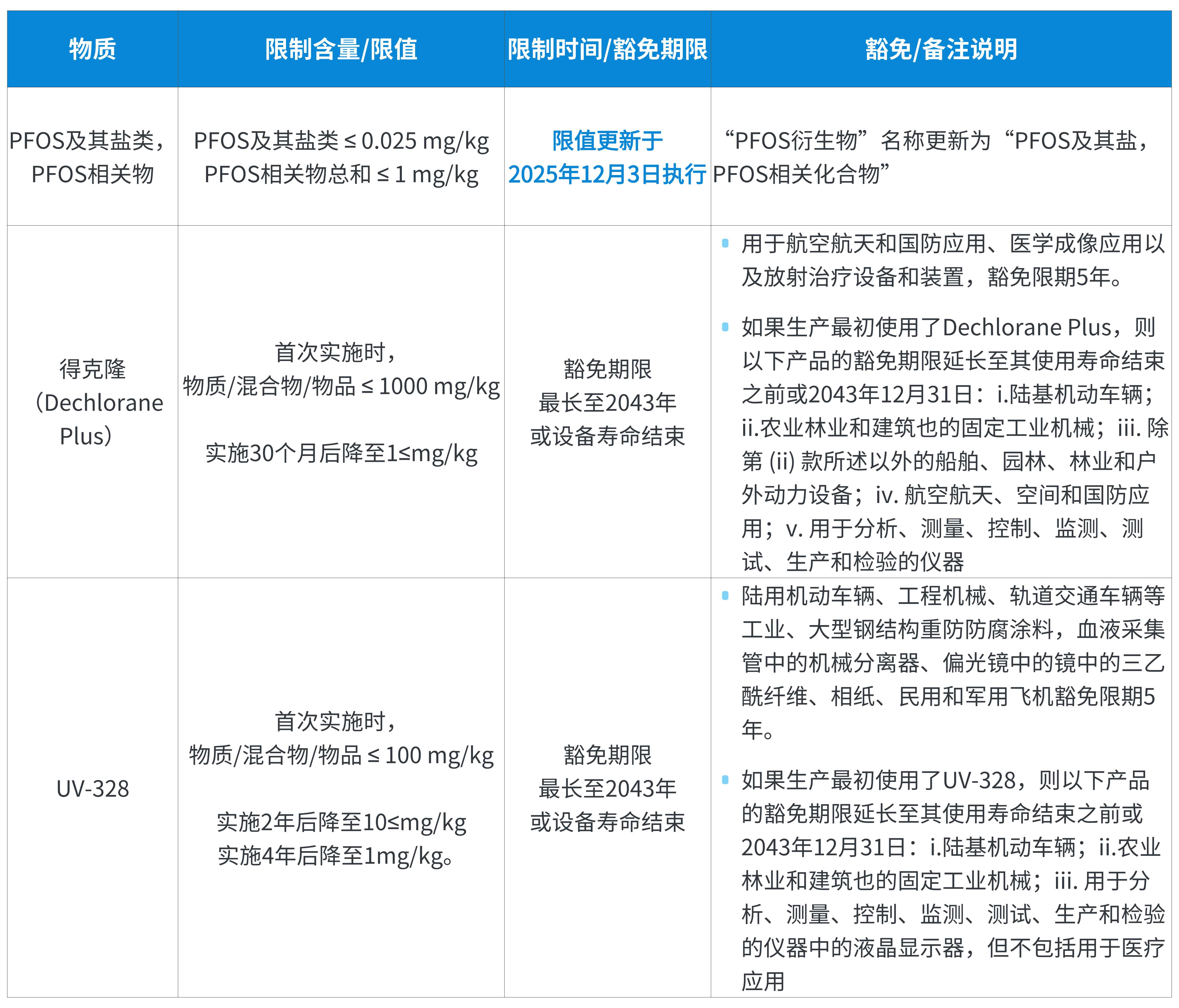 6月27日,欧洲官方公报正式发布POPS针对PFOS及其盐和相关物质的修订案(EU) 2025/718,更新其名称和限值要求,该修订案将于发布之日起20日后(即7月17日)正式生效,关于新的限值要求将于2025年12月3日执行。并且,在2025年上半年期间,欧盟委员会陆续采纳并通过了多项修订草案,涉及新增受控物质、调整现有物质管控要求以及特定豁免的变更等。这些更新包括将得克隆、UV-328等物质纳入管制清单。