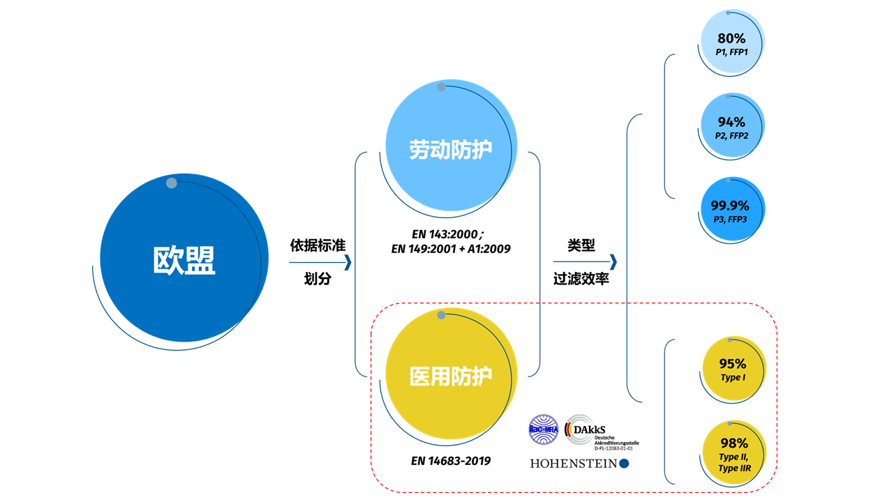 在欧洲,口罩根据欧盟标准划分为“劳动防护”和“医用防护”两种。其中,医用外科口罩属于Ⅰ类医疗器械产品,并受医疗器械法规(Medical Device Regulation,MDR)EU 2017/745的管辖。