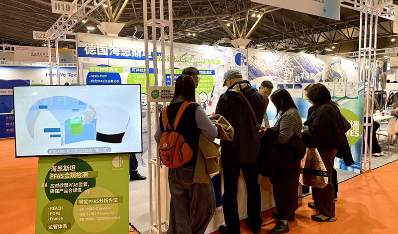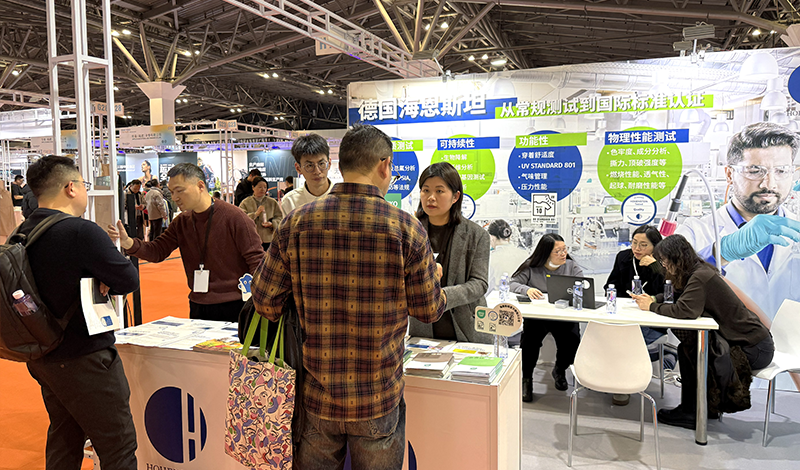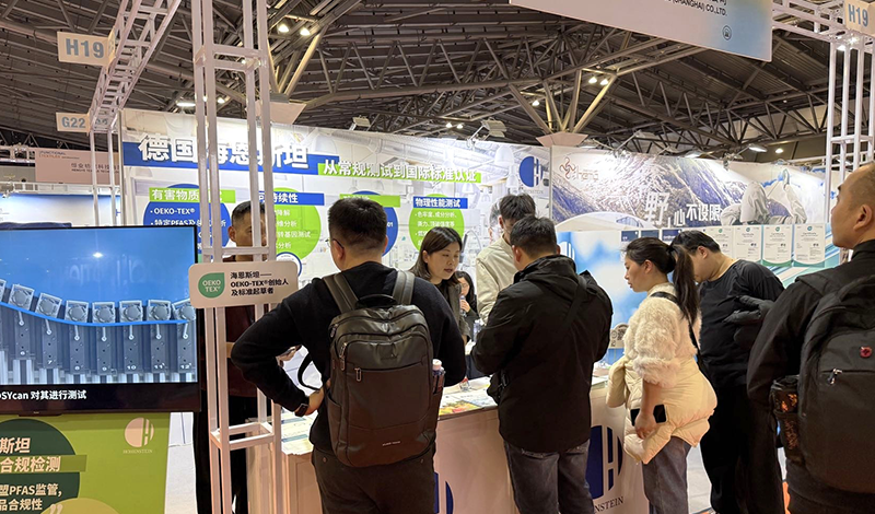 展会现场,海恩斯坦展台吸引了众多业内同仁驻足交流。主要围绕研发型功能性测试项目,包括生理裤测试、抗菌性能、生物相容性、UV STANDARD 801、压力测试、气味管理以及PFAS管控等有害物质检测内容,进行了详细咨询。海恩斯坦技术人员结合企业不同的测试需求,现场给予个性化的解决方案,并对有出口需求的企业给出了相应的合规建议。