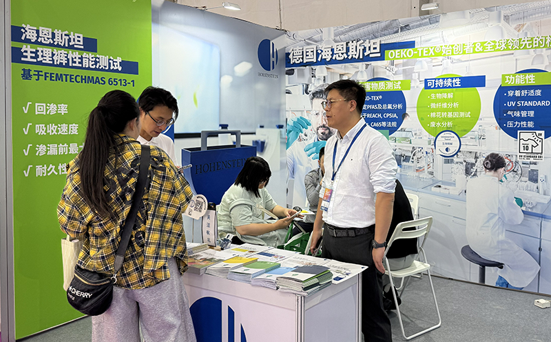 展会期间,海恩斯坦展台前咨询观众络绎不绝,到访客户针对出口合规问题、产品可持续认证和功能性测试等展开一系列咨询,海恩斯坦技术人员对OEKO-TEX®认证、PFAS测试、欧盟法规限用物质检测等解决方案进行了详细解答和分享。其中,针对生理裤这一新兴细分品类的专项测试服务,受到许多内衣生产商的高度关注与咨询。
