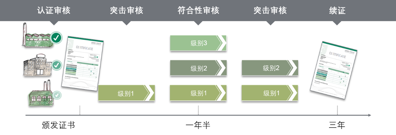 STeP证书有效期为三年。证书的等级水平主要取决于仅此现场审核和整个评估过程。在三年有效期内,评估的等级可以根据每次审核和验证的结果进行更新。企业获得证书之后,还要经过两种不同的审核:合规性审核以及突击审核。根据企业所达到的级别不同,审核次数也会相应不同。目的是为了帮助企业不断改进和优化生产体系,督促企业获得证书后仍能继续按照该体系进行标准生产。