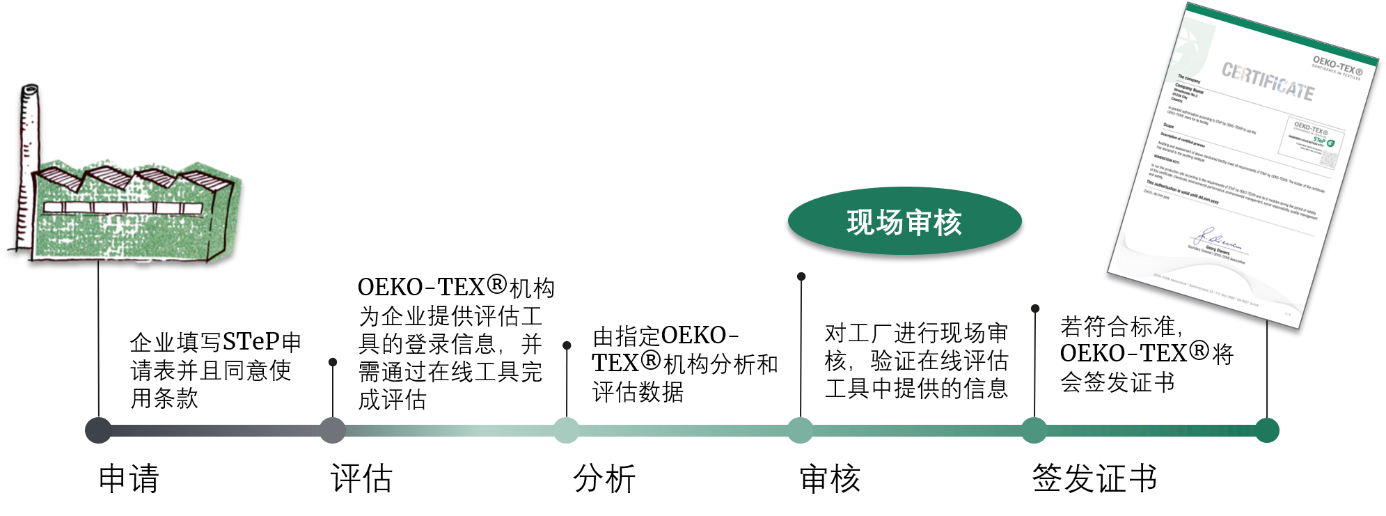 评估方式: STeP认证的评估包括问卷调查和现场审核。申请企业通过在线评估工具填写详尽的调查问卷,并提交相关文件证明,OEKO-TEX®成员机构将对企业填写的信息和数据进行分析和评分,后续审核员在对生产工厂进行现场审核时,还将对这些信息进行验证和确认。成功完成这两个过程后,经过确认的企业将收到STeP证书和审核报告。