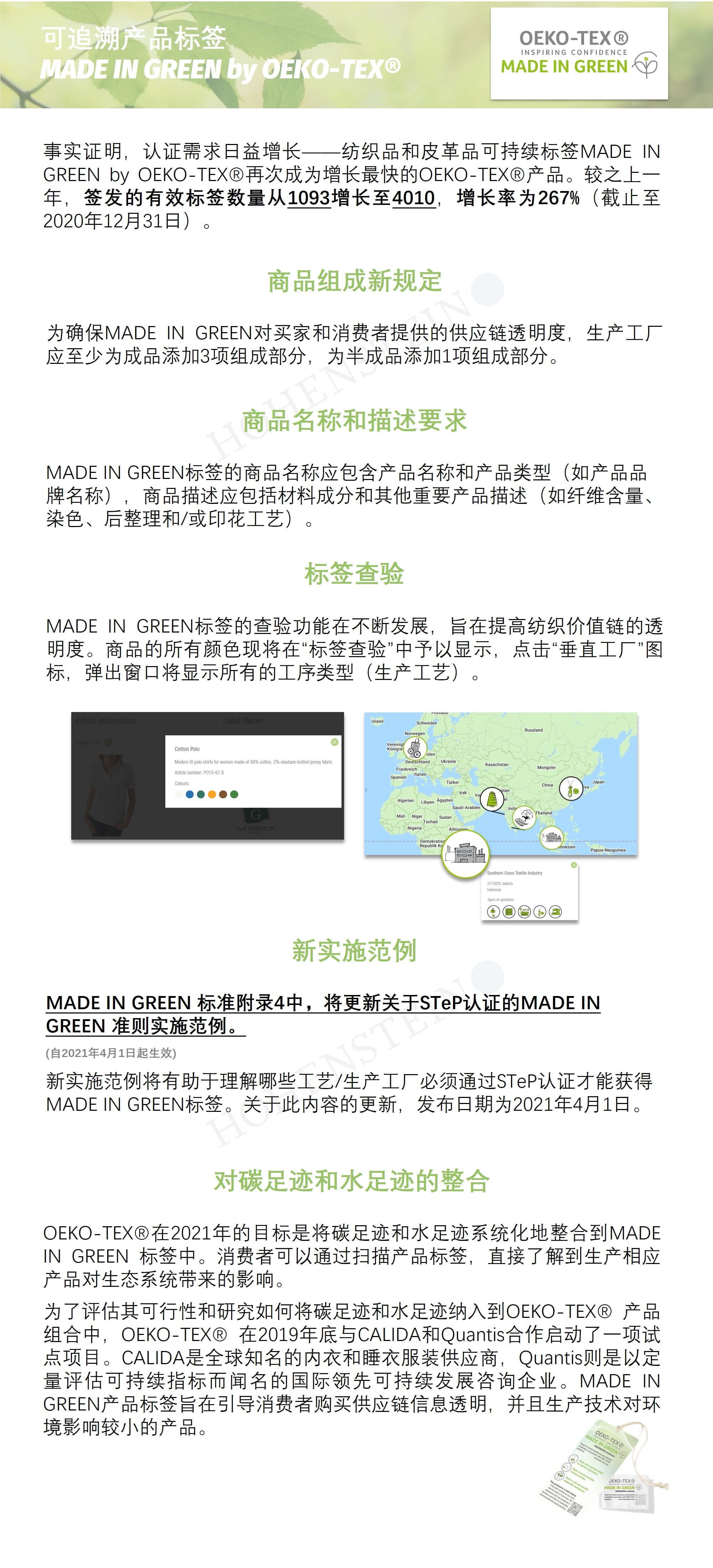 OEKO-TEX®2021年目标是将碳足迹和水足迹系统化地整合到MADE IN GREEN标签中。这样消费者扫描产品标签后,可以直接了解到商品生产给生态系统带来的影响。
