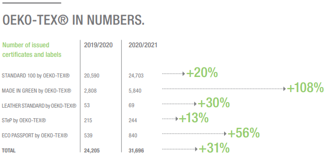 到目前为止,来自100多个国家/地区的超过21,000家制造商、品牌商和零售商选择与OEKO-TEX®合作。在2020年7月1日至2021年6月30日期间,协会签发的标签和证书数量从24,205增加至31,696。