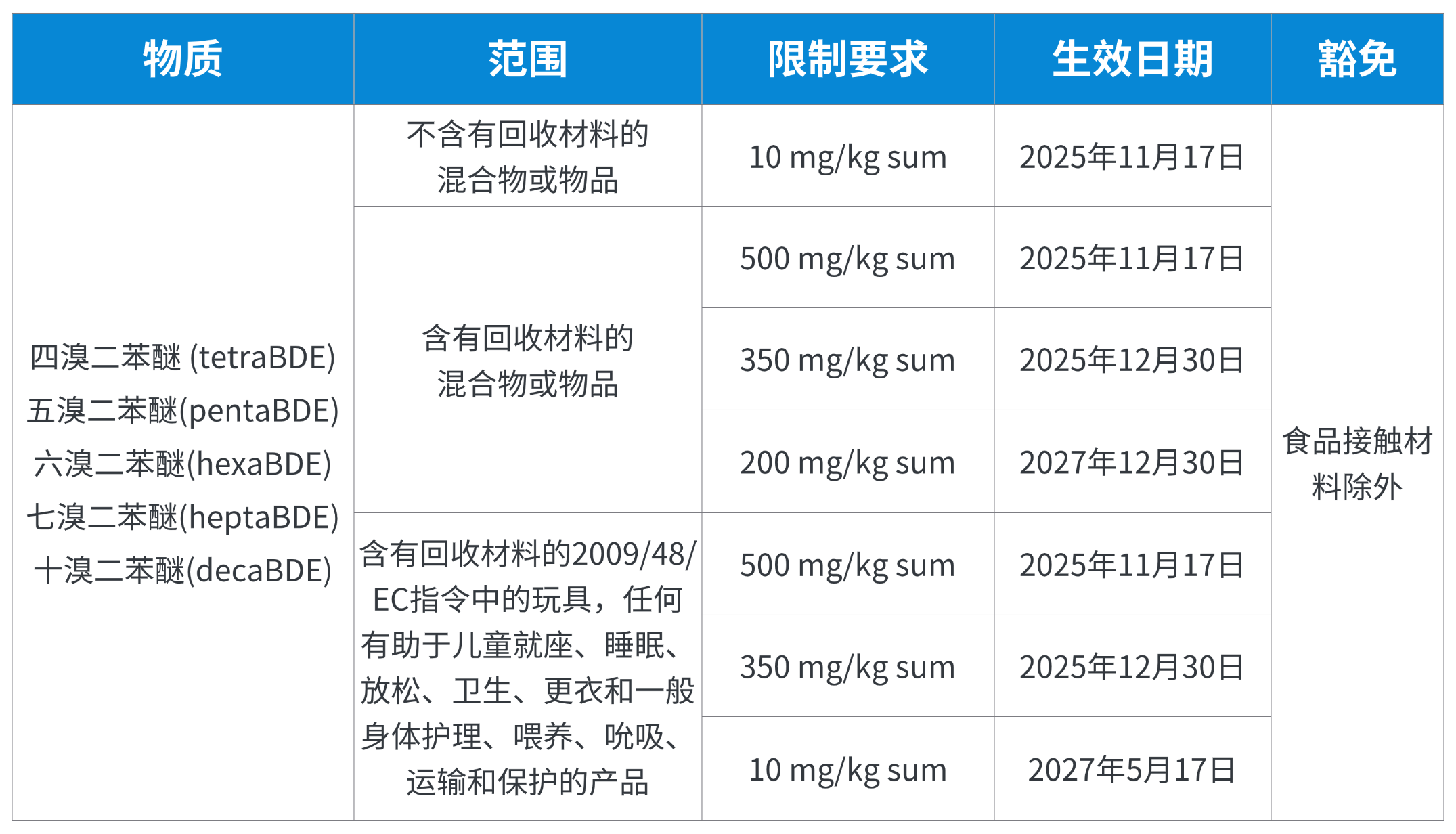 2025年10月28日,欧盟正式发布对POPs法规附录修订条例(EU) 2025/1482,针对禁用物质清单中的多溴联苯醚(PBDEs)的管控限制进行调整,最新限制要求已于2025年11月17日正式生效。该条例对原生或常规材料(非回收)、回收材料(含玩具及儿童护理用品)进行了分阶段管控,食品接触材料和产品不在该管控范围内。具体更新内容如下: