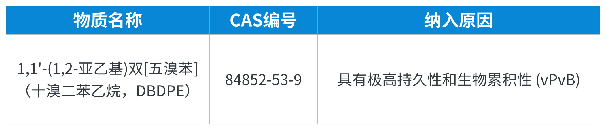 2025年11月5日,欧洲化学品管理局(ECHA)确认将1,1’-(1,2-亚乙基)双[五溴苯](十溴二苯乙烷,DBDPE)加入到SVHC候选物质清单。至此,SVHC候选物质清单正式更新为251项。